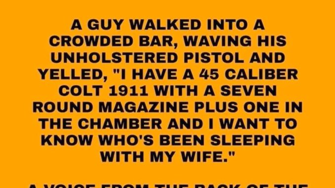 “I have a 45 caliber Colt 1911 with a seven round magazine plus one in the chamber and I want to know who’s been sleeping with my wife.”