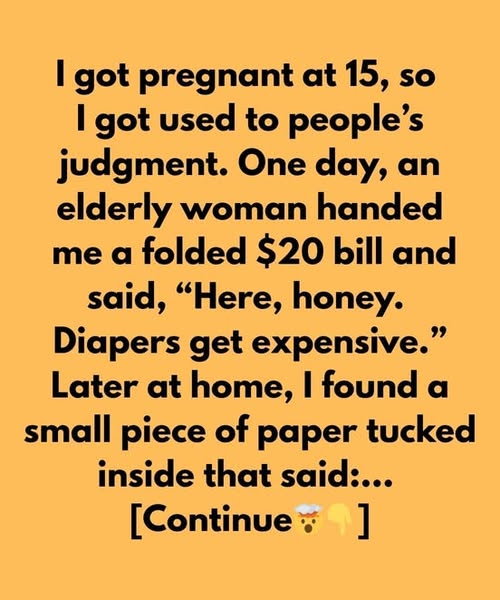 I got pregnant at 15, so I learned early what judgment feels like. The stares, the whispers, the people who thought my life was already over before it had even begun. I got used to it—sort of. You build up a wall just to keep going. One afternoon, while standing in line at a corner store with a few groceries and a tired baby on my hip, an elderly woman behind me gently tapped my shoulder. She smiled, handed me a folded $20 bill, and said softly, “Here,