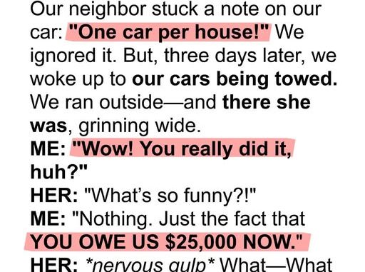 Both our cars fit perfectly, but she insisted, “No exceptions.” We shrugged it off as an overzealous neighbor.Three days later, before dawn, two tow trucks showed up, hauling away both our cars. Lindsey stood nearby in her bathrobe, grinning as if she’d won a battle. But then, we revealed a small sticker on our car windows—unseen by her—that marked them as government vehicles. She was stunned.