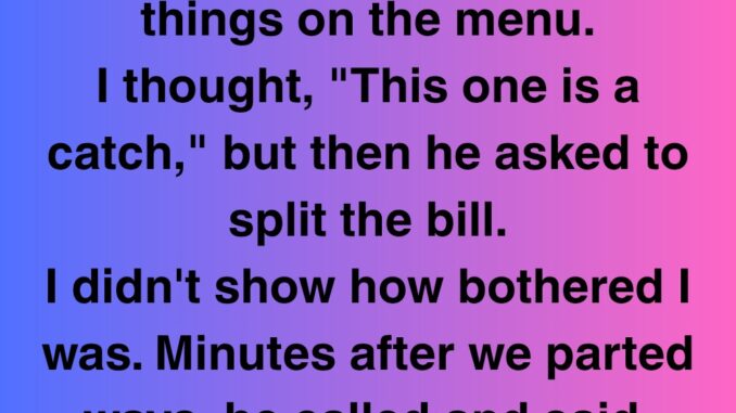 I went on a date with a guy. He ordered the fanciest things on the menu. I thought, “This one is a catch,” but then he asked to split the bill. I didn’t show how bothered I was. Minutes after we parted ways, he called and said, “Hey! I just noticed that you still owe me $3.75 for your half.”