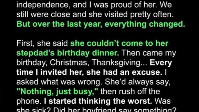 I used to think my daughter Nina and I were inseparable. At 25, she was independent but still made time for Sunday dinners, birthdays, and movie nights. Then the visits stopped—first missed occasions, then holidays, then months of distance. Her excuses sounded polite but hollow, and her voice carried a strange detachment I couldn’t ignore….